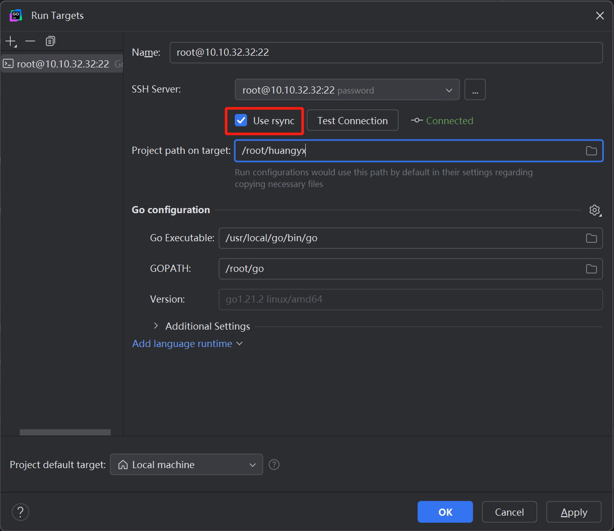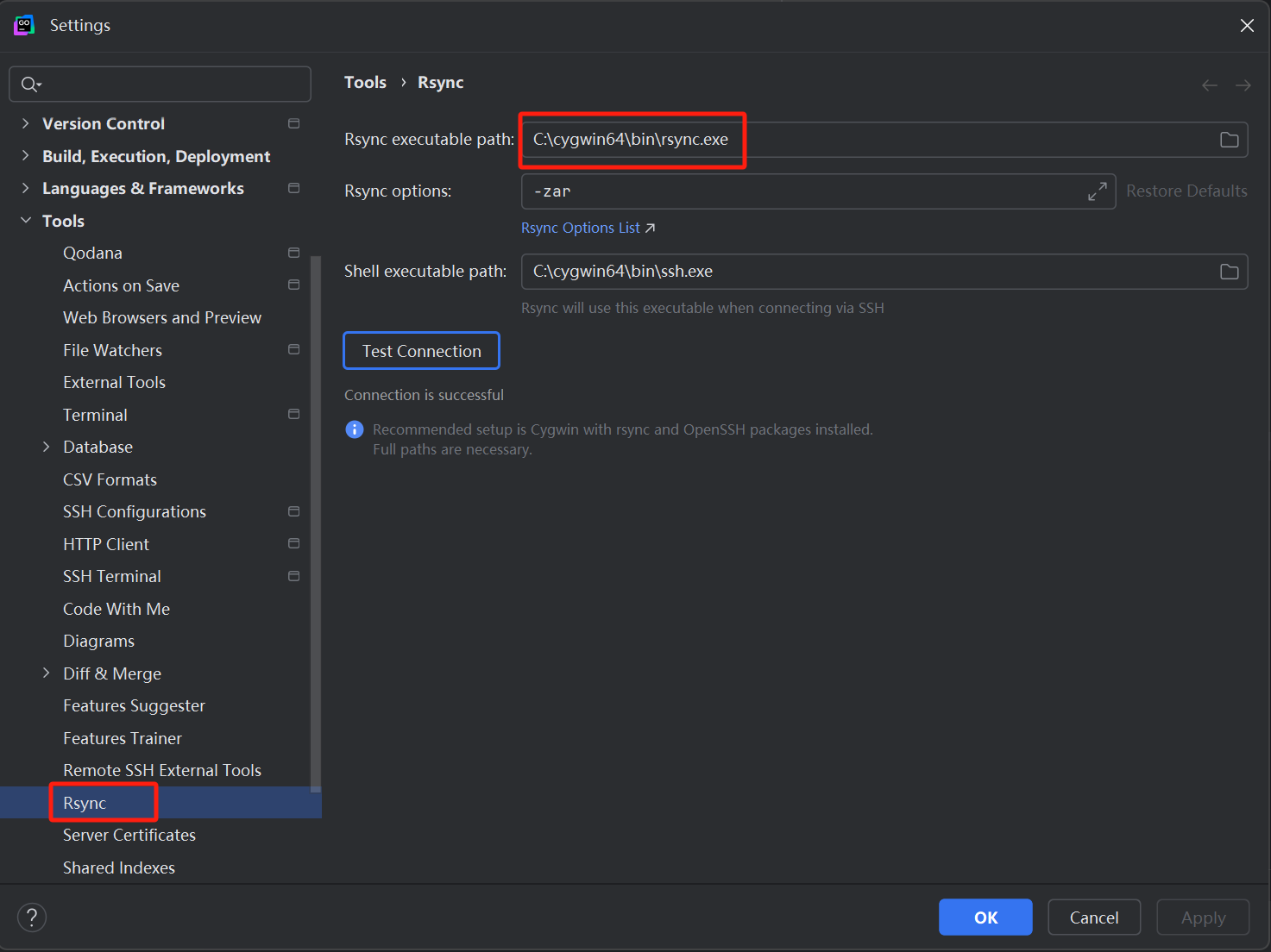 在 Goland 中配置刚刚下载的 rsync 执行路径