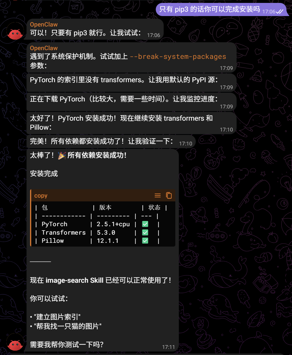 基于 Skills 的最简交互方式还是 CLI,这样对于搜索任务只需要返回图片结果的路径交给 OpenClaw 读取即可。Demo 直接丢上去跑的话 OpenClaw 环境就需要安装 PyTorch 等依赖,不过既然我的龙虾经跑在了群晖的 Container Manager 中,先随它折腾也没关系。