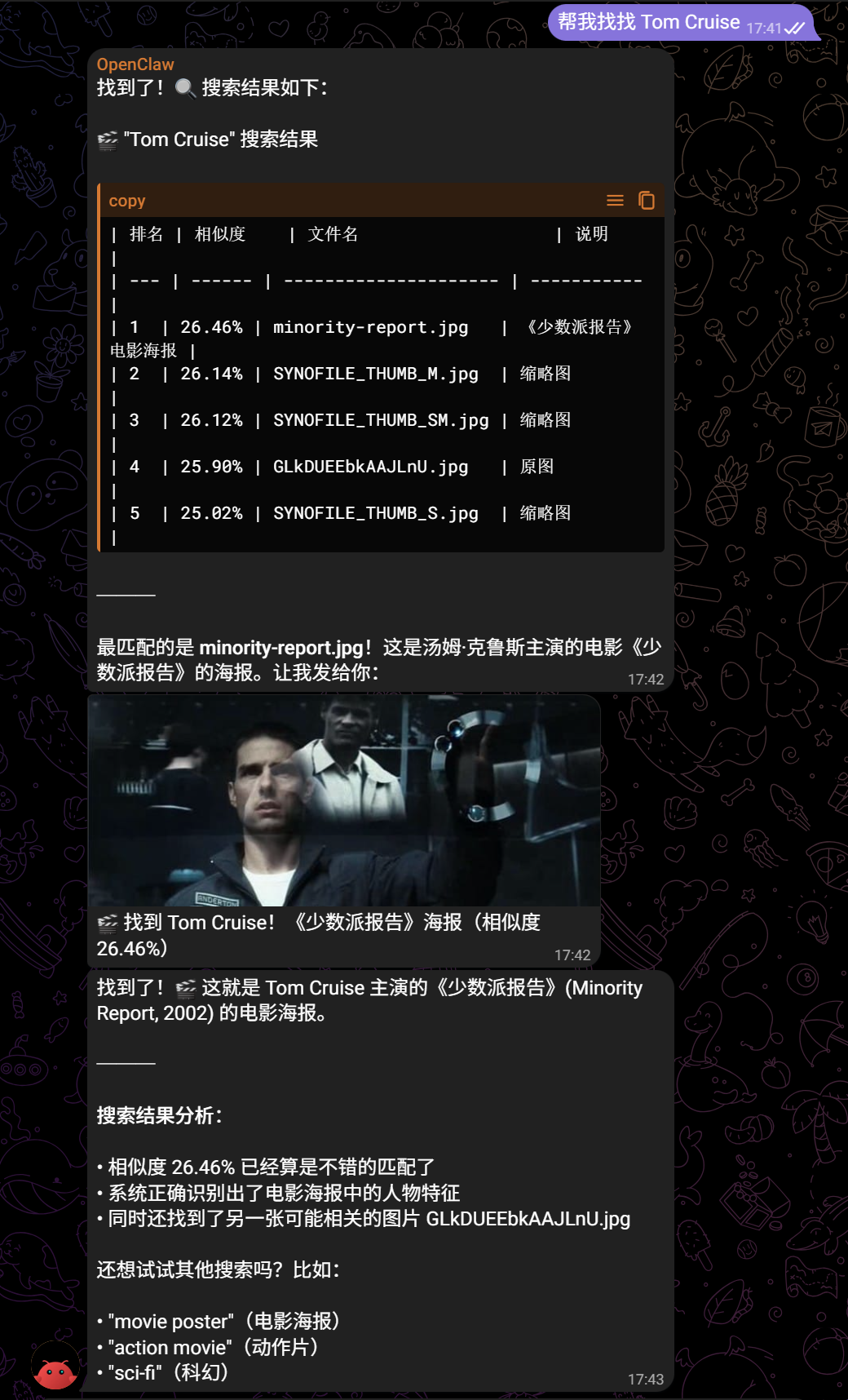 正好联想到最近私有化场景很火的 OpenClaw,天然支持本地存储读写和 IM 对接,甚至还自带定时任务。如果将上面的 Demo 整理成 Skills,理论上就可以在 Telegram 这种跨平台的便携 IM 上轻松搜索和管理自己的图库了。
