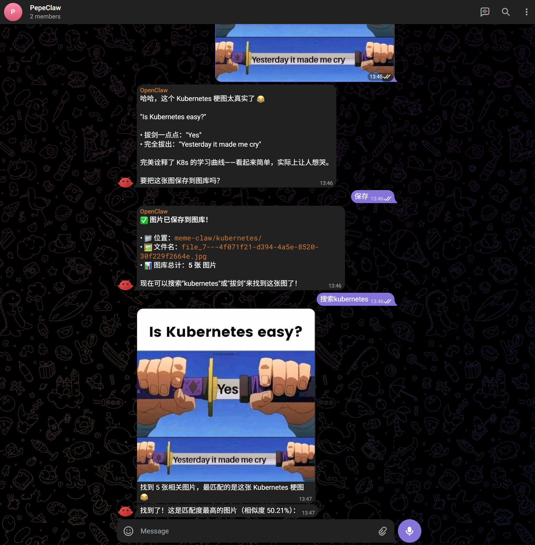 直接使用 pt 文件存储路径和向量映射的方式虽然不太优雅,但是目前单次检索大约也就几秒钟,主要的瓶颈还是在于 LLM 的思考输出时间。至于批量上传可以直接在 telegram 上批量发送图片,也可以依赖群晖的文件同步服务,作为一个玩具 skill 暂时也别无他求了。